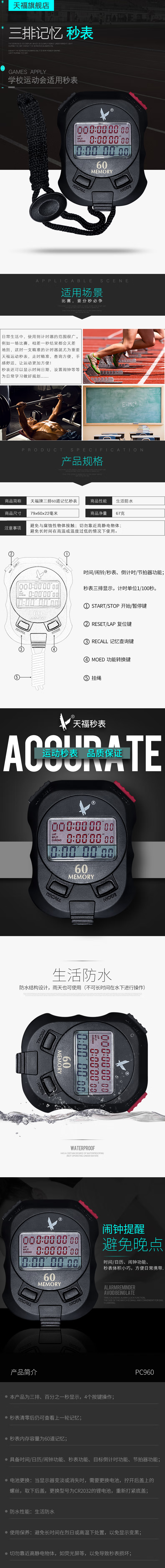 天福 PC960 秒表专业体育运动比赛跑步学校运动会记忆秒表三排60道 进口机芯